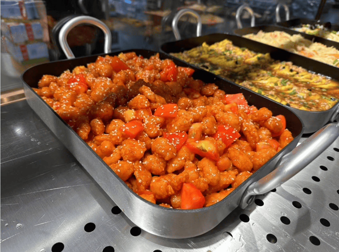 這批平價快餐店的菜品幾乎都是用大鐵盆盛裝,整齊碼放,主要由服務員進行統一分餐或者消費者自取。