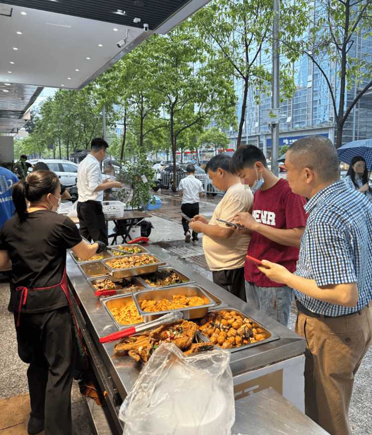 自助類型的門店,有的是先付款再取餐,也有的是取完餐後再付錢,店內的所有菜品、米飯、湯品均可自取。店員包含兩類,一類是後廚人員、負責菜品的烹製,另一類負責收桌、搞衞生。