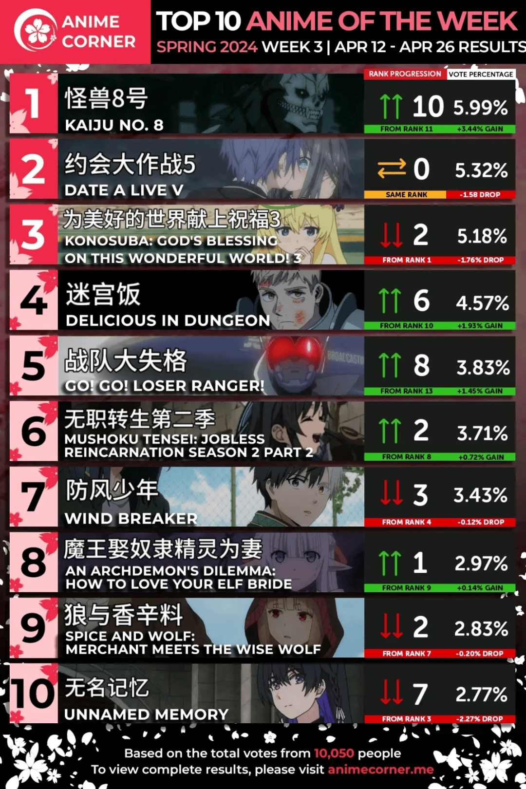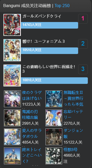 以具體數據來説,《怪獸8號》如今在X每週直播的觀看人數已經掉落至幾千人;登頂Anime Corner動畫人氣周榜後,多次掉到10名開外;在國內動漫愛好者聚集的Bangumi上僅有4千多組員,不及人氣第一《Girls Band Cry》組員數量零頭;B站播放量也直到更新十話才破億。