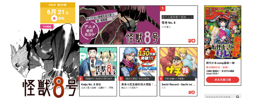 日本網絡漫畫市場競爭非常激烈,除了以Piccoma為代表的韓漫“入侵”,日本各個漫畫出版社也在積極挖掘網絡漫畫市場。集英社旗下的漫畫平台JUMP+之所以還能位居日漫APP前列,不僅是因為藤本樹的《電鋸人》,也有《間諜過家家》《怪獸8號》這些台柱作品。