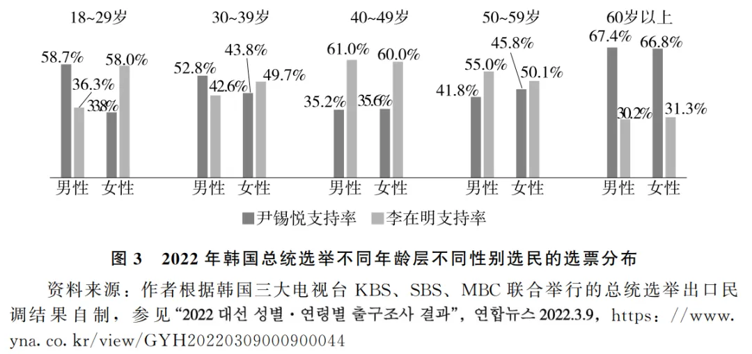 **“性別情理陣營”**形成於2022年的總統選舉中,是由保守派政治家李俊錫、尹錫悦等人構建的。相互對峙的兩個“性別情理陣營”分別由青年男性和女性構成。相比之前的兩個“情理陣營”,“性別情理陣營”的構建表現出更明顯的策略性。兩性平等是韓國社會現代化轉型以來長期存在的議題。進入21世紀,韓國年輕人圍繞兩性平等和女性主義思想開始出現意見對立。2010年前後,互聯網上出現了“嫌女”論壇與“嫌男”論壇相互攻擊的現象。2016年,一名男性因憎惡女性而隨機殺害了一名女性,引發了大規模悼念和示威活動。2018年,為了譴責警察在執法中偏袒男性,首爾又發生了6次女性示威集會,參加者達到36萬人次。2019年的一項研究發現,在互聯網和社交媒體空間,兩性平等話題已經取代就業話題,成為年輕人最關注的社會問題。需要注意的是,這種社會矛盾雖然激化,但在最初的十多年裏主要以社會問題的形式存在。文在寅在2017年選舉中因為親女性主義的形象得到了女性選民的好感,但當時並未出現年輕男女的陣營化現象。年輕男女的陣營化現象出現在2022年大選前夕,起因是2020年韓國修改《選舉法》,將選民年齡由19歲下調至18歲,各政黨開始更加積極地爭取年輕選民。在年輕人中支持率較低的保守派政黨國民力量黨任用36歲的李俊錫為黨代表,**李俊錫策略性地批判女性主義,煽動年輕男性的受害意識。**而保守派總統候選人尹錫悦則在競選中稱韓國已經不存在結構性的性別不平等,兩性平等政策違背了能力主義和自由競爭原則。**尹錫悦聲稱當選後要解散女性家庭部,將性別認知預算改為國防預算,**針對職場性騷擾訴訟設立誣告罪,取消僱傭中的性別配額等。在尹錫悦成功獲得年輕男性的支持後,進步派政黨候選人李在明則主動與女性主義團體靠近。2022年的選舉結果顯示,18~29歲男性中,支持尹錫悦的佔58.7%,支持李在明的佔36.3%。18~29歲的女性中,支持尹錫悦的佔33.8%,支持李在明的佔58%。在18~39歲選民中,60%的男性支持尹錫悦,60%的女性支持李在明。年輕男性對保守派政治家的偏愛與年輕女性對進步派政治家的偏愛旗鼓相當,而其他年齡層中不存在這種男女間立場對峙現象,由此可見,年輕人在政治家的鼓動下形成了“性別情理陣營”(見圖3)。