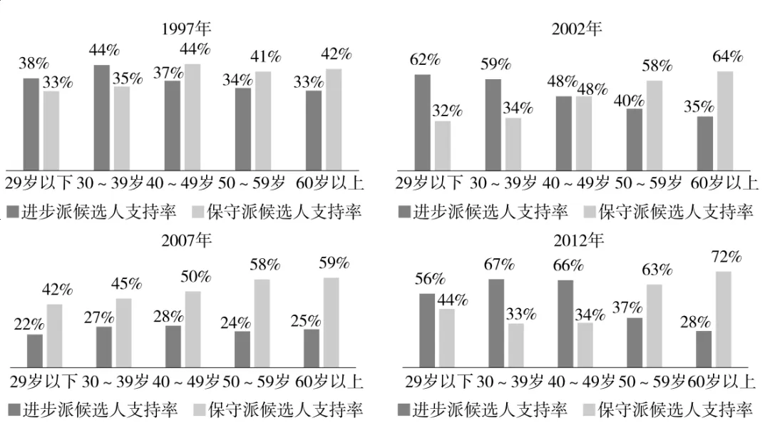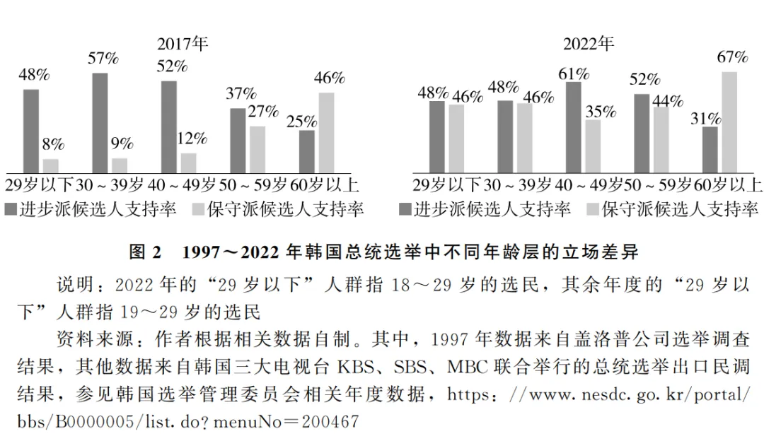 “世代情理陣營”產生於2002年的總統選舉中,最初的構建者是當時的總統候選人盧武鉉。“世代情理陣營”中的兩大對峙人羣分別是工業化世代和民主化世代。工業化世代出生於20世紀50年代前後,目睹了戰後美國對韓國的援助,被大量反共教育洗腦,經歷了20世紀後半期的快速工業化進程。民主化世代出生於20世紀60~70年代,他們在青少年時期參與或目睹了民主化運動,具有強烈的批判精神、民主參與意識和民族自決意願。這兩個世代原本不具有明確的政黨偏向性。2002年總統選舉前夕,一名駐韓美軍軋死了兩名韓國中學生,引發了大規模反美遊行示威。進步派政黨候選人盧武鉉在示威人羣中喊出了“反美又如何”的口號,贏得了民主化世代的支持。盧武鉉當選總統後遭保守派彈劾,民主化世代發起反彈劾示威,並在緊隨其後的國會選舉中高比例支持進步派政黨。這些現象被媒體稱作“年輕人的叛亂”以及“世代之戰”。有了之前“地域情理陣營”的經驗,兩大政黨很快分別與上述兩個世代建立起了情感共鳴,並以其代言人自居。自此之後,民主化世代和工業化世代分別成為進步派政黨與保守派政黨的穩定支持者(見圖2)。