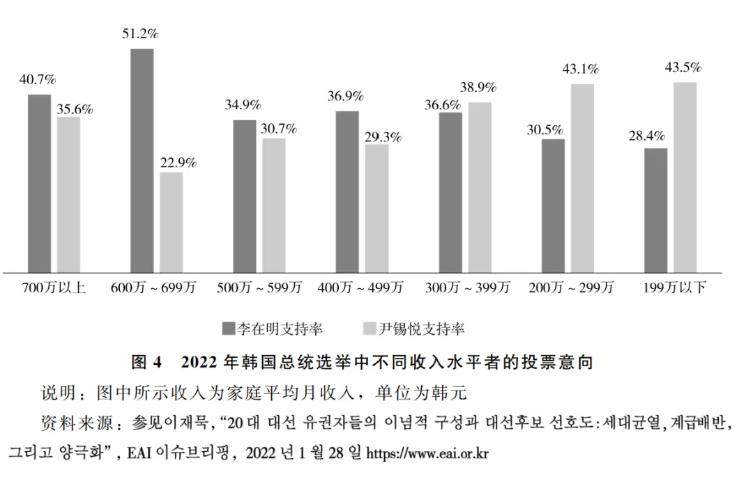 作者指出,儘管韓國財閥壟斷、貧富分化等問題突出,然而選舉中經濟分配議題因“情理陣營”的出現而明顯淡化,乃至出現了“高收入人羣往往更加支持強調分配的進步派政黨,而最貧窮的韓國人偏向支持保守派政黨”的怪象。