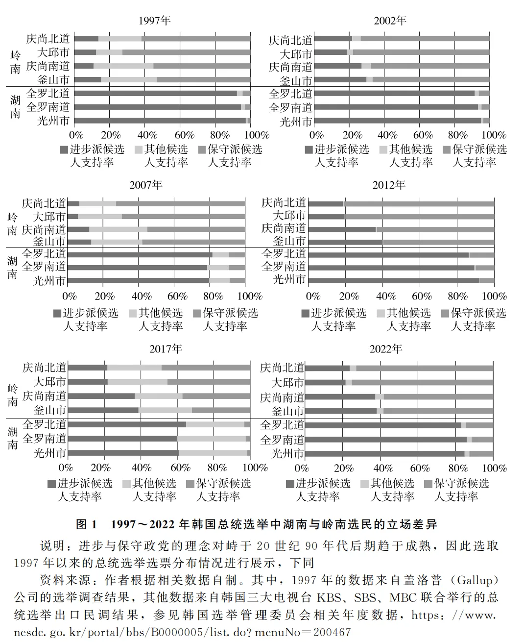 **“地域情理陣營”形成於民主化轉型過程中。1987年的總統選舉標誌着韓國民主化轉型的開始。在這次選舉中,曾經主導民主化運動的金大中和金泳三得以與軍政府出身的盧泰愚展開競爭。金大中和金泳三的家鄉分別屬於湖南地區和嶺南地區,這兩個地區的選民都選擇支持他們的同鄉。“同鄉票”在這次選舉中起到了決定性作用,導致民主化運動陣營分化,盧泰愚最終當選總統。**盧泰愚當選後,為擺脱國會掣肘,與金泳三領導的政黨結成政治同盟,孤立了金大中領導的政黨,進一步加深了民主化陣營的分化。在下一屆總統選舉中,金大中與金泳三再次展開爭奪戰,金大中的故鄉湖南地區的選民在“背叛”“復仇”等話語的鼓舞下空前團結,將91%的選票投給了金大中。嶺南地區受此影響,將68.8%的選票投給了金泳三。在緊隨其後的國會選舉中,二人領導的兩個政黨也分別在他們各自的故鄉獲得高比例支持。20世紀90年代後期,韓國政黨格局逐漸呈現進步派和保守派兩大寡頭政黨對峙的局面。金大中領導的政黨成為進步派政黨,以民主化運動的繼承者自居,對內較為關心弱勢羣體,對外主張民族自決,提出了對朝“陽光政策”。隨着韓國法院對全斗煥、盧泰愚鎮壓民主化運動、貪污腐敗的行為展開審判,曾經在民主化運動中發生大規模流血事件的湖南光州被塑造成民主化運動的聖地,在民主化運動中屢遭迫害的金大中被稱為“忍冬草”,“進步派政黨”“金大中”“湖南人”一同被貼上了民主鬥士和受害者的標籤。與之相對的,保守派政黨則把嶺南地區作為政治故鄉。這裏在軍政府時期曾經走出多位總統,也是重要的重工業基地,被認為是既得利益集團的聚集地。此後,湖南與嶺南民眾對同鄉政治家的認同逐漸轉變為對政黨的認同。在嶺南地區選出的議員中,保守派政黨黨員長期佔多數。同樣,在湖南地區選出的議員中,進步派政黨黨員長期佔多數。回顧自民主化轉型以來湖南和嶺南選民在總統選舉中的投票情況可見,湖南選民長期偏向支持民主派政黨候選人,嶺南選民長期偏向支持保守派政黨候選人。特別值得注意的是,2002年,出生於嶺南地區的盧武鉉反而成為進步派政黨的總統候選人,在進步派政黨的政治故鄉湖南地區得到了高比例支持。這標誌着湖南與嶺南已經不再是單純的地理文化空間,兩個地區與兩大政黨之間的鏈接已經超越了“同鄉情”,變成了對政治理念以及特定政黨的認同(見圖1)。