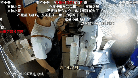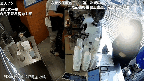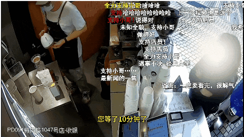 店員一開始還是比較心平氣和的,“您下單時間是8.15,現在是8.25,已經等了10分鐘了。我跟您説,大約8分鐘左右下一杯就是您的,咱們時間差不多,這個是您的,8點15(下單的),您是344號,現在08:25分10分鐘。”