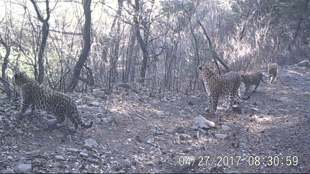 也是這一年,F2當媽媽了。4月,F2帶着3只幼豹從一處紅外相機前經過,這是我們在和順第一次拍到華北豹的三胞胎。