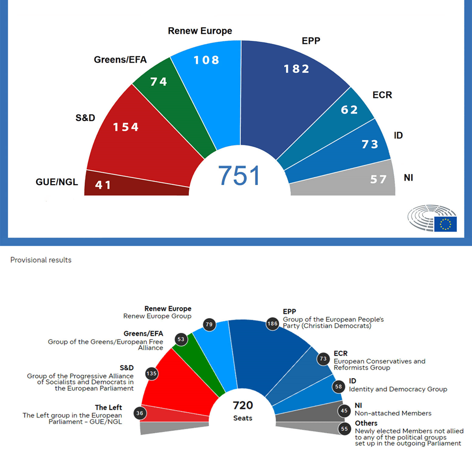 在這個被馬克龍稱之歐盟“可能會死去,可能會消亡”,桑切斯視為“歐洲的靈魂,正處於危險之中”(1)的重要時刻,歐盟27個成員國的共約四億有選民,投票選出了本國將派往斯特拉斯堡這個作為歐盟立法、監督、預算和諮詢機構共751個席位的代表。其中,人數最多的是德國,在聯合王國退出後達到了96人。法國和意大利緊隨其後,分別是81、76席。