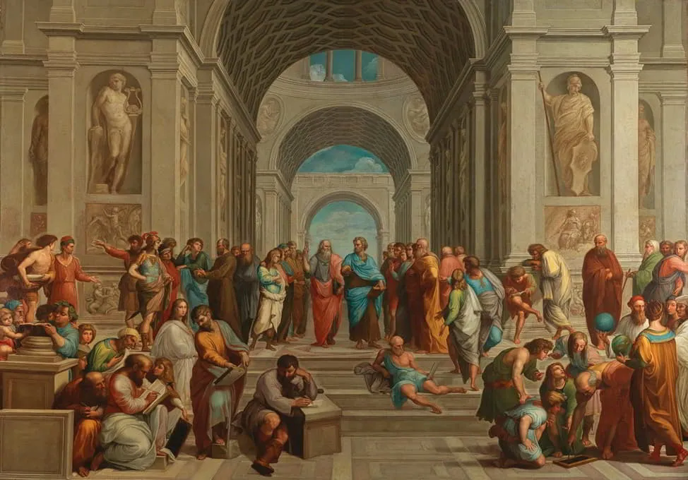 ▲《雅典學院》是意大利畫家拉斐爾創作的著名畫作。該畫打破了時空界限,把代表着哲學、數學、音樂、天文等不同學科領域的文化名人匯聚一堂,被認為是文藝復興時期的代表作。“西方偽史論”最著名的論點之一是文藝復興時期思想家“託古改制”,導致古希臘,古羅馬文化“真假難辨”。畫面的中心是柏拉圖和亞里士多德。