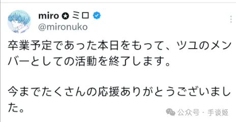 “從今天起,我就不再是TUYU的成員了,謝謝大家長久以來的應援了。”——miro