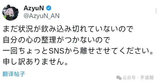 “我現在對這件事情還有點狀況外,而且不能整理好自己的思緒,我想離開SNS一段時間,對不起。”