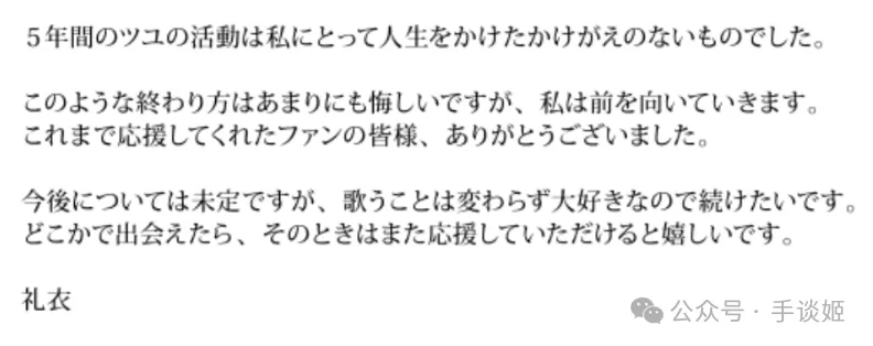 “在TUYU活動的這五年是我這一生都無法替代的東西。雖然以這種方式結束真的非常的不甘心,但我還是得向前看。真的非常感謝一直在支持我的粉絲們。雖然前路未知,但我會在我最愛的唱歌這條路上走下去的。如果再相遇的話,如果還能繼續喜歡我的話,我會很開心的。”——禮衣