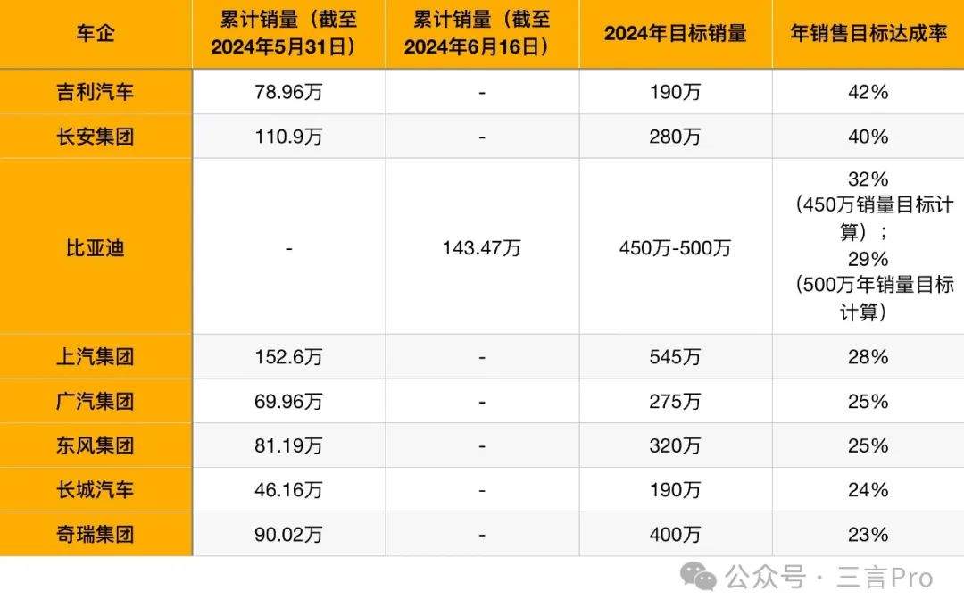 那麼,2024年即將過半,對於國內車企來説,也到了“期中考試”時間。在如此高強度競爭的市場中,各車企制定的年銷售目標完成度如何呢?
