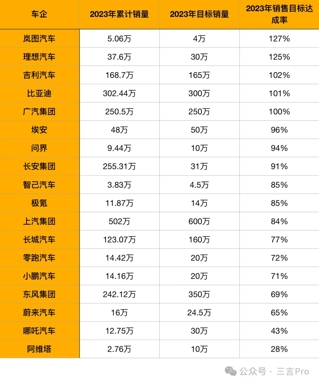 上表是大部分今天統計的車企2023年銷量以及銷售目標達成率情況,可以看出,除了阿維塔僅完成28%銷量目標和哪吒汽車完成43%銷量目標不足五成外,其他大部分車企完成度都相當高。
