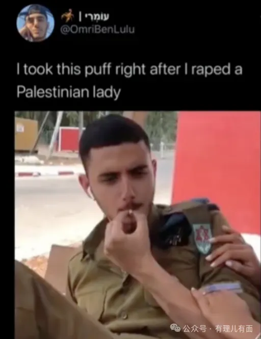 一名以色列士兵在社交媒體上發文稱“我強姦了一位巴勒斯坦婦女之後就吸了這口煙。”他還配上了自己的自拍照,看得出來,這名以色列士兵很得意。