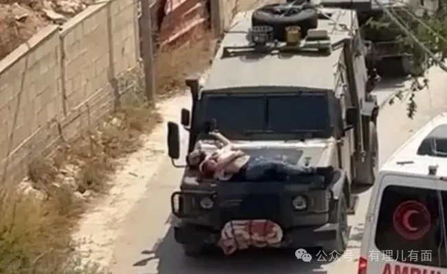 這可太有“道德”了,以軍可能是覺得吉普車內的空間太狹小,怕這位巴勒斯坦兄弟睡得不舒服,所以讓他在寬敞的引擎蓋上躺着,不過以軍忘了給這位巴勒斯坦兄弟遞個枕頭……