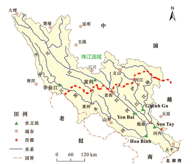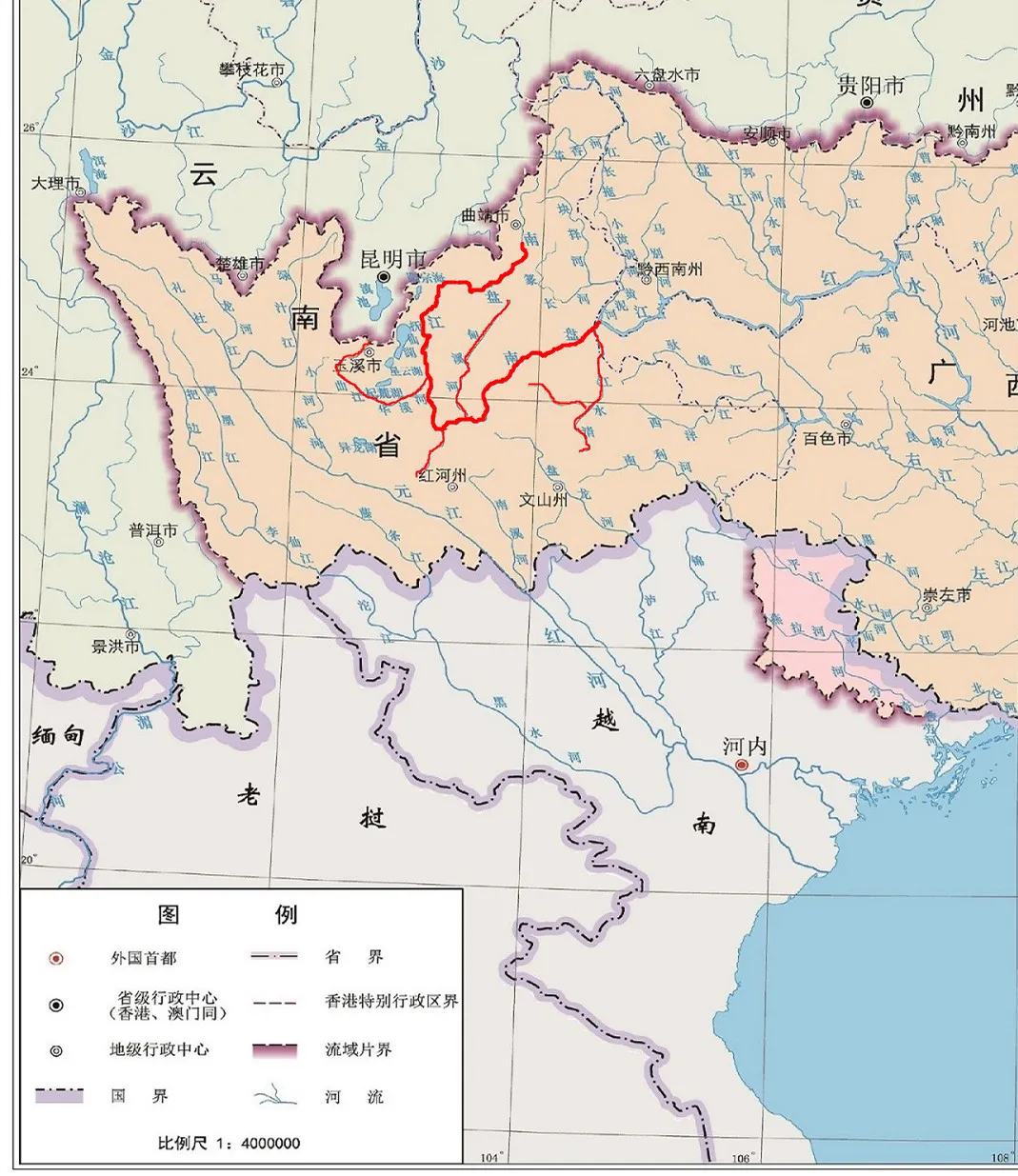 下圖是元江-紅河流域地圖,圖中可見非常直的元江-紅河干流,火急火燎地跑到越南去了,它的勢力很強大,裹挾了李仙江、盤龍江等河流,紅色是國境線。南盤江在紅河流域的中間,拐彎—北返,硬生生地挖了一坨區域出來,成了珠江流域的一部分!