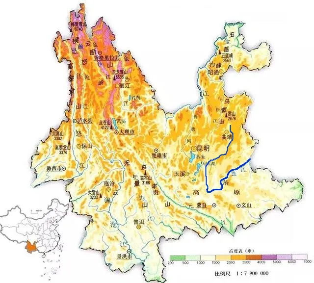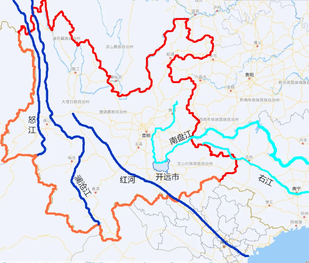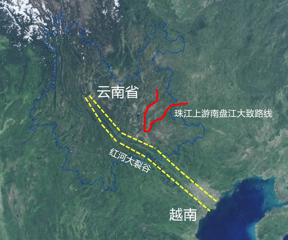 元江-紅河發源於雲南大理,斜着在雲南中部切了一道很深的口子,衞星地圖上清晰可見,裂口一直切到越南北部,直通北部灣,河流一瀉千里!不出意外的話,雲南中南部、東南部基本所有的河流,都會被峽谷很深的紅河俘獲,因為水往低處流!