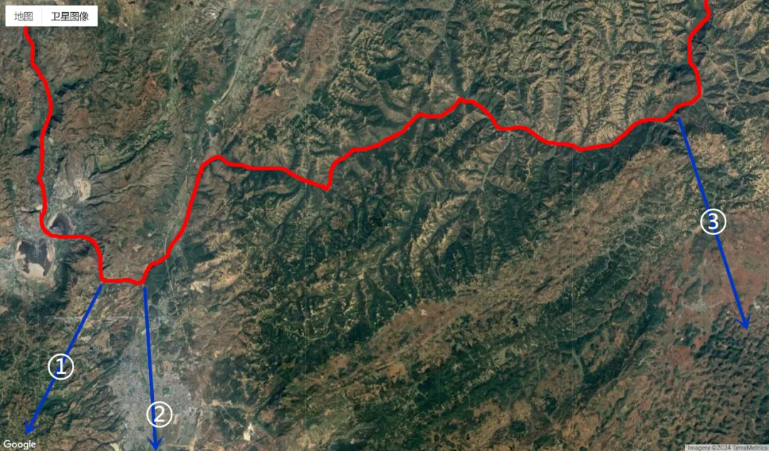 南盤江在開遠市境內,先來了一個90多度的拐彎,變成向東流,繼而再拐成東北。下圖可以看出總的地勢特點,紅色是南盤江的大致線路,它前進的方向都是山區,反而南部有兩塊盆地,其中至少有3次非常危險:可能通過開遠壩子①②路線往南走,可能通過文山州的硯山縣平遠鎮壩子③路線往南走。結局都一樣:被紅河俘獲,裹挾着注入北部灣,那就跟中國沒關係了。