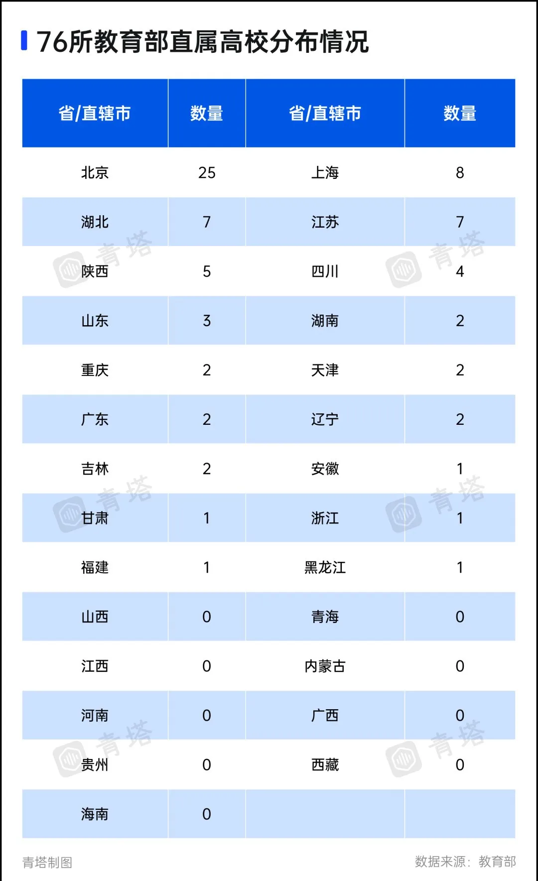 部屬高校也是如此。全國共有76所教育部直屬高校,北京佔了25所,上海8所,江蘇湖北各7所,四川6所,山東3所,廣東湖南重慶都是2所。