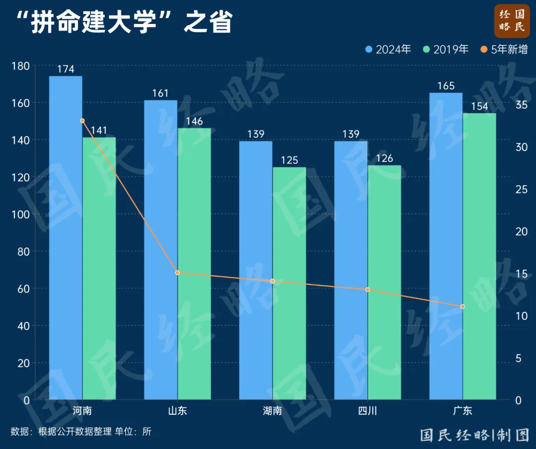 功夫不負有心人。**短短几年過去,河南高校數量從141所大幅增加到174所,**新增高校數量佔到全國的1/5左右,堪稱“拼命建大學”的最大贏家。