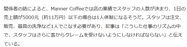 日媒也報道了Manner coffee店鋪運營基本情況:店鋪根據業績決定店員人數,1天銷售額在5000元以下的,只配1個店員。