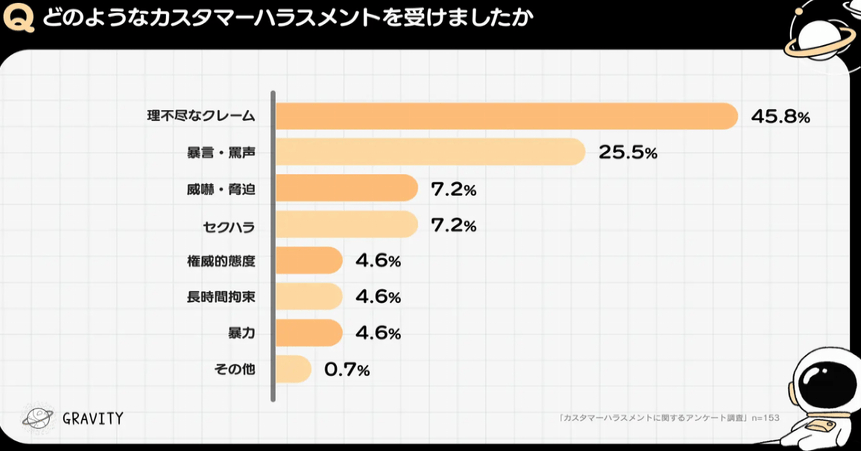 顧客騷擾的具體內容,有 45.8%的是“不合理的投訴”,有25.5%的是“粗話、罵人”。