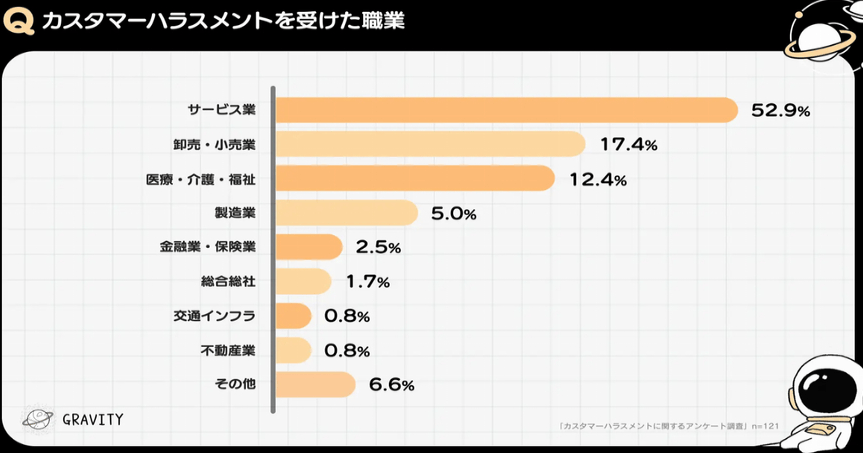 遭遇顧客騷擾的行業中,最多的來自服務業,佔比52.9%。其次是批發零售業、醫療、護理、福利行業。