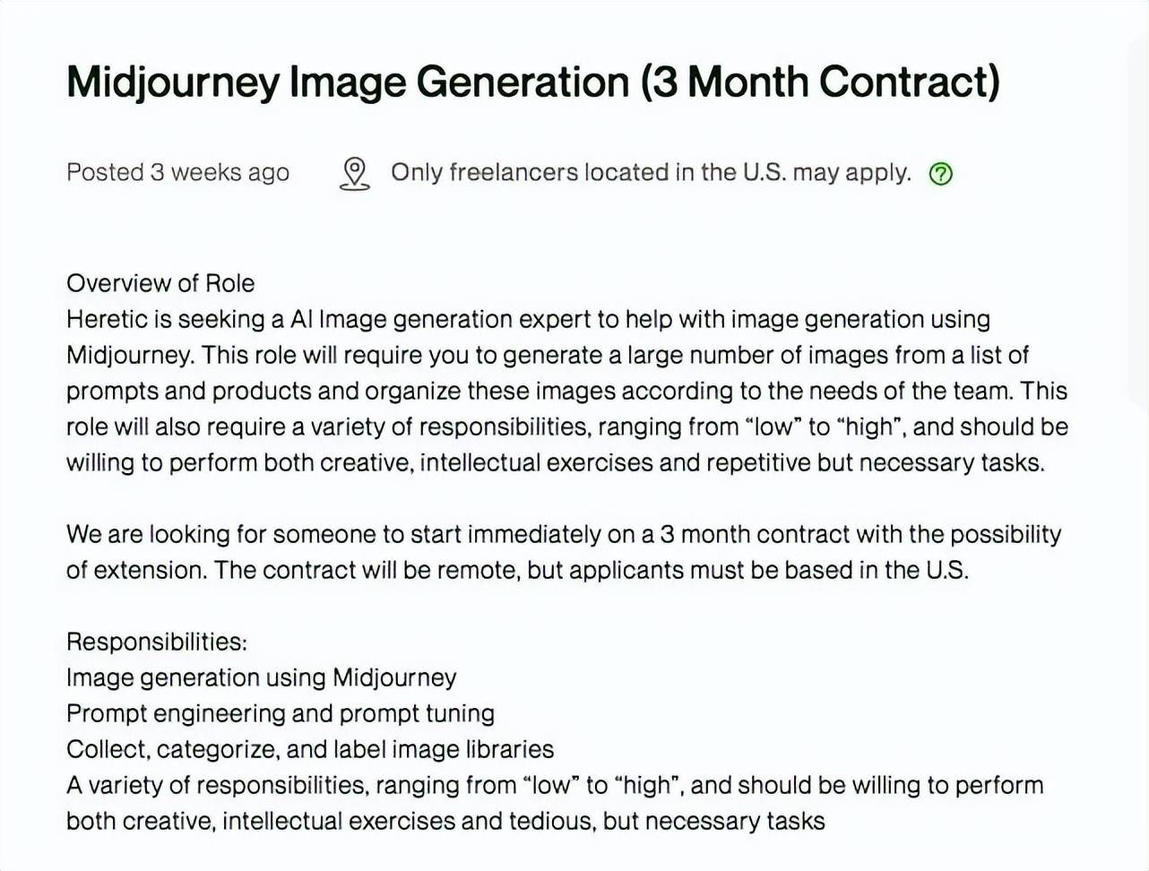 同樣,我認為這是因為像 DALL-E 和 MidJourney 這樣的工具需要一些知識和創造力。這一點在一些招聘信息中很明顯,它們明確要求尋找 AI 圖像創建專家。與寫文章不同,使用 AI 工具創建視覺上驚豔的圖像需要了解如何構建良好的提示詞、如何調整提示詞以及大量的試驗和錯誤。