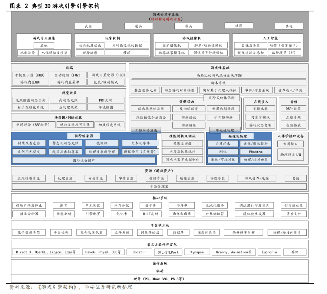 發展到今天,一個遊戲引擎基本都會包括渲染、物理、骨骼動畫、音效、視覺效果、人工智能、網絡引擎、場景管理等核心功能模塊。其中,負責呈現出足夠真實的畫面和遊玩體驗的渲染引擎和物理引擎則是核心競爭力的所在。