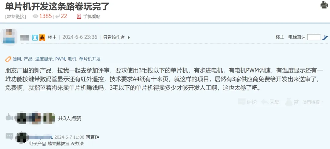 一位工程師在某電子論壇反映,有廠裏的新產品要求使用3毛錢以下的單片機(MCU),各項功能齊全,技術要求的A4紙寫滿了十來頁。而就是這樣成本要求苛刻,沒有利潤空間,技術支持繁多的項目,竟有3家供應商免費開發來競爭。