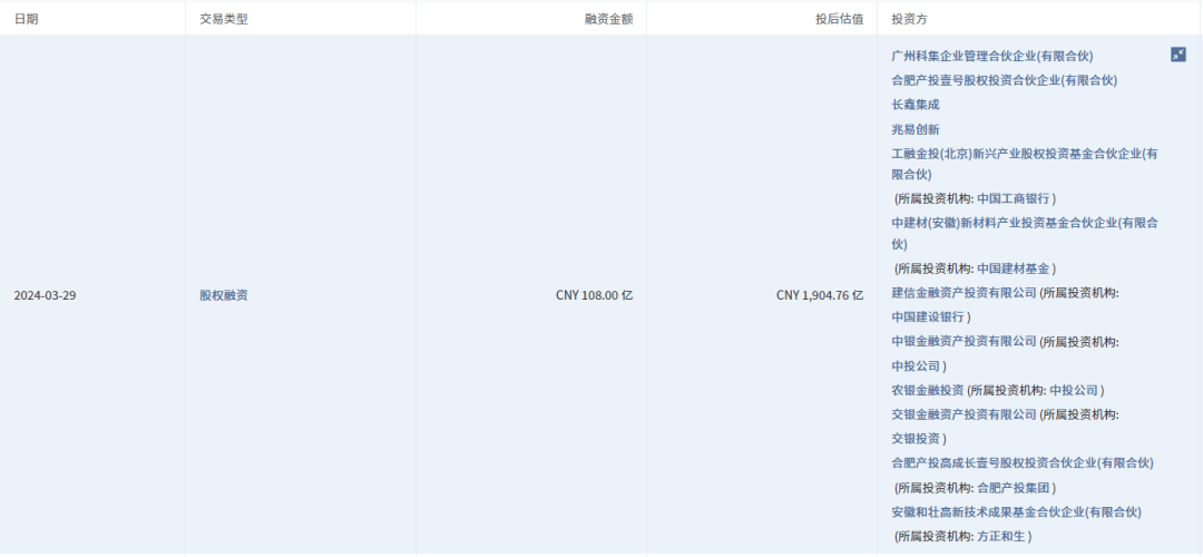 隨後,長鑫存儲通過股權轉讓、股權融資方式完成了3輪融資。其中,今年3月完成了新一輪融資,融資金額108億元,碧桂園創投持股比例降為1.6805%。