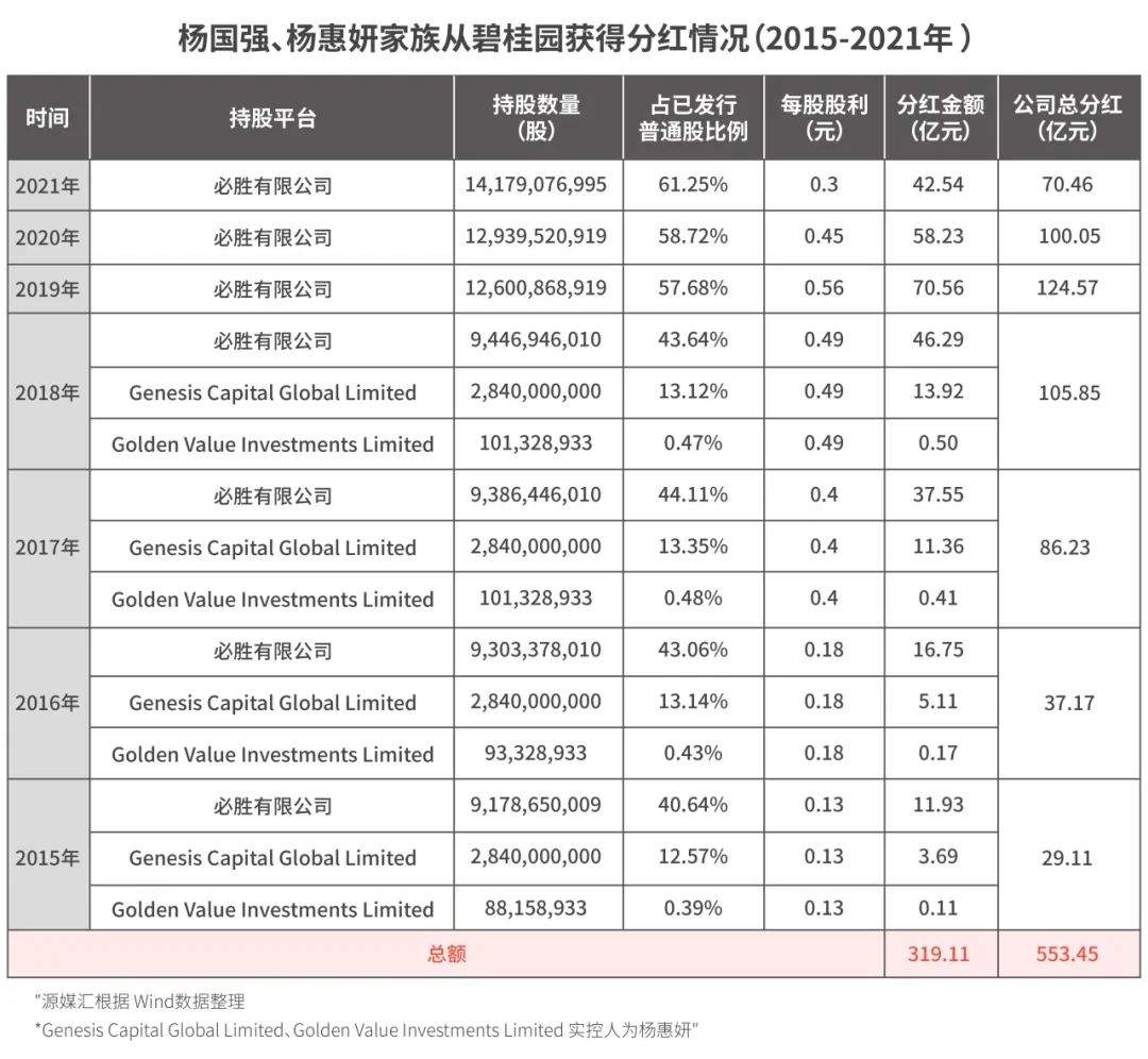 7年時間僅通過現金分紅,楊國強、楊惠妍家族獲得了319億元,佔碧桂園總分紅金額的57.66%。