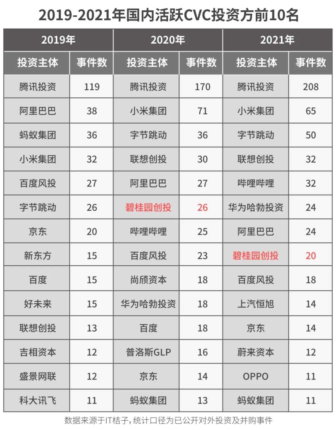在IT桔子的統計數據中,成立第2年,碧桂園創投登上國內CVC投資方第6名位置,2021年排在第7位,超過百度、京東(NASDAQ:JD,09618.HK)互聯網巨頭等。