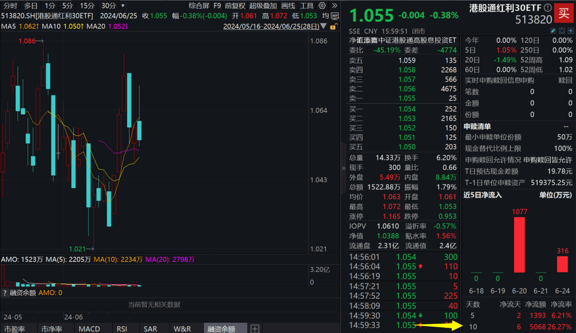 【港股紅利小幅震盪,港股通紅利30ETF(513820)近10日獲資金增倉超5000萬元】