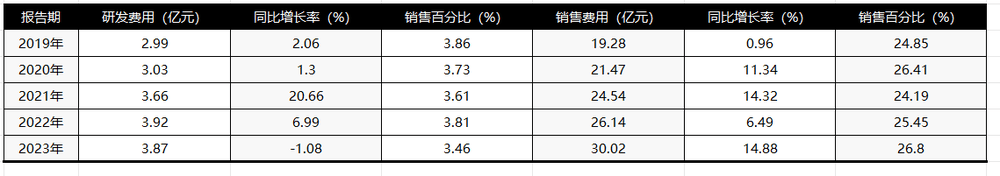 但從老闆電器近5年的財報來看,其研發費用僅從2019年的2.99億元增長到2023年的3.87億元,同期銷售費用卻從0.96億元增長至14.98億元。銷售費用率大幅度高於研發費用率,老闆電器為典型的銷售驅動業績增長。