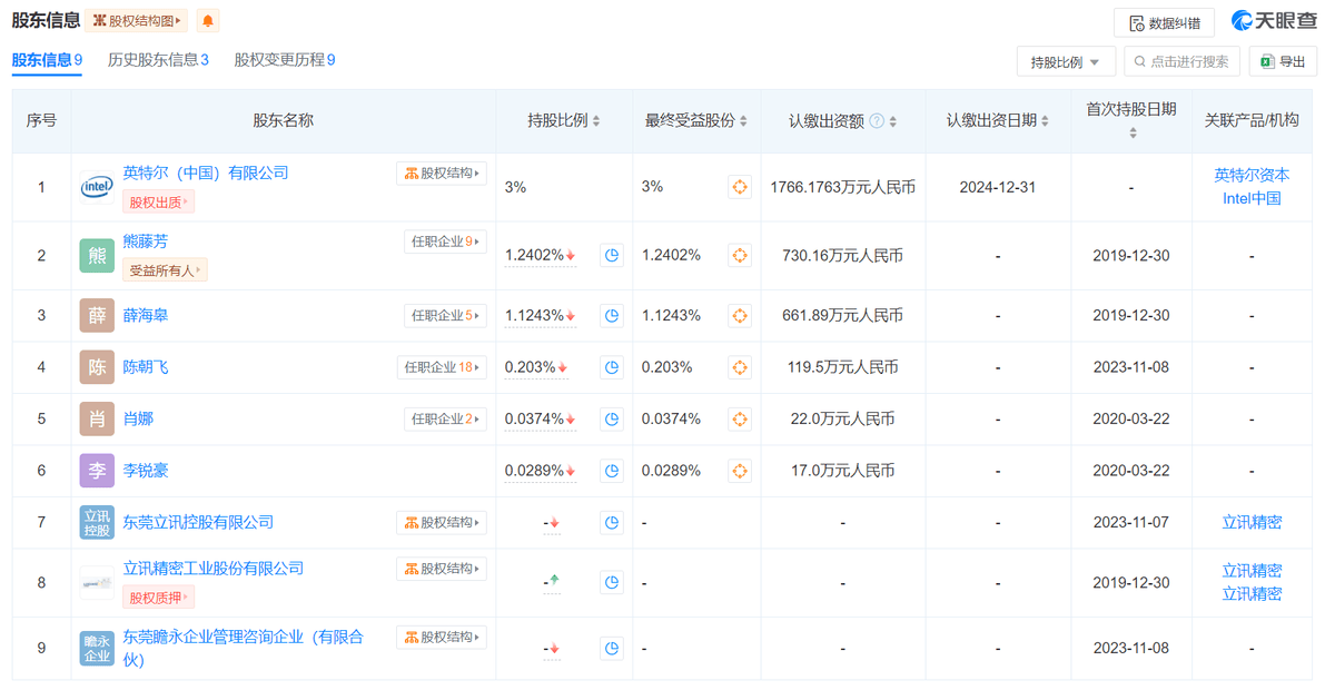 回到業務本身,可以發現立訊精密已經有了更多嘗試,比如攜手全球芯片巨頭英特爾。天眼查信息顯示,英特爾已入股立訊精密旗下東莞立訊技術有限公司,持有該公司3%的股份,認繳出資額為1766萬元。