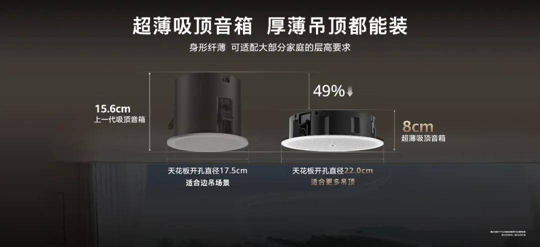 華為全屋智能的沉浸式全屋音樂正在成為新裝修用户的“新寵”,8cm 超薄音腔設計輕鬆滿足各種户型,可調節角度旋轉高音喇叭,超薄吸頂音箱基於全新雙向無源輻射器對稱音頻佈局,下潛可達到 40Hz,能在帶來震撼澎湃低音體驗的基礎上,大幅度減少對天花板的震音影響。在家中不同空間,音樂可以無縫穿越,用户也可以根據不同的心境選擇最匹配的音樂—— 空間高級感來自於音樂的無處不在和隨心而動。