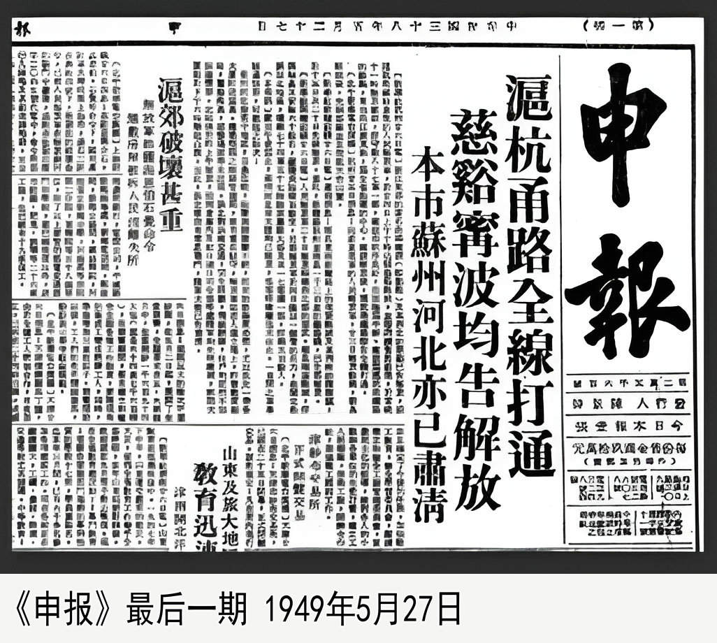 《申報》原名《申江新報》,1872年4月30日(清同治十一年三月二十三日)在上海創刊,1949年5月25日,解放軍接管上海蘇州河南岸市區,中共委派工作組進入報館。由於此時《申報》已為啊,因而終刊必在意料之中。5月27日上海解放,《申報》第25599號後宣佈終刊。28日,中共中央華東局兼上海市委機關報《解放日報》在申報館原址上出版第一期。