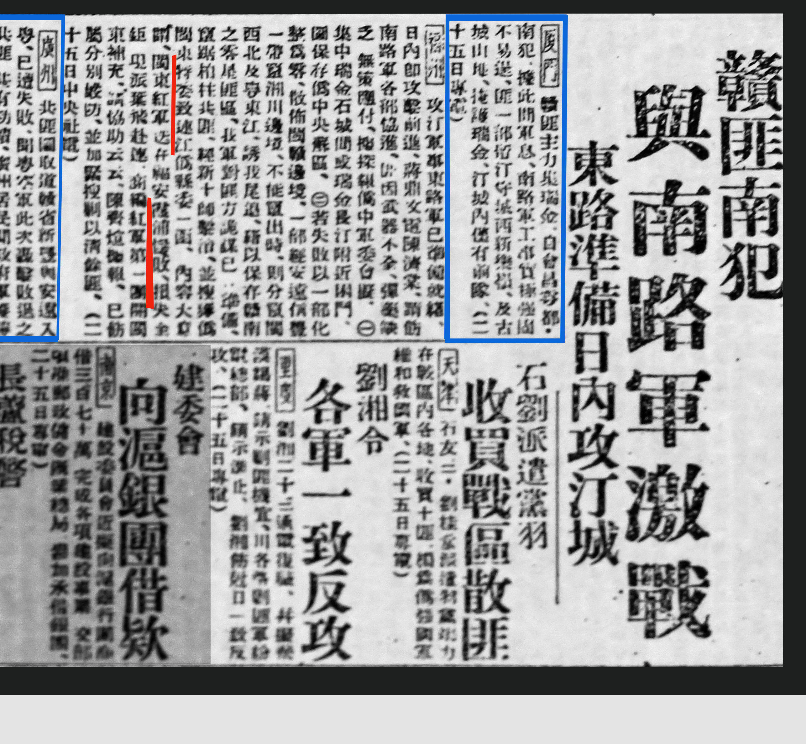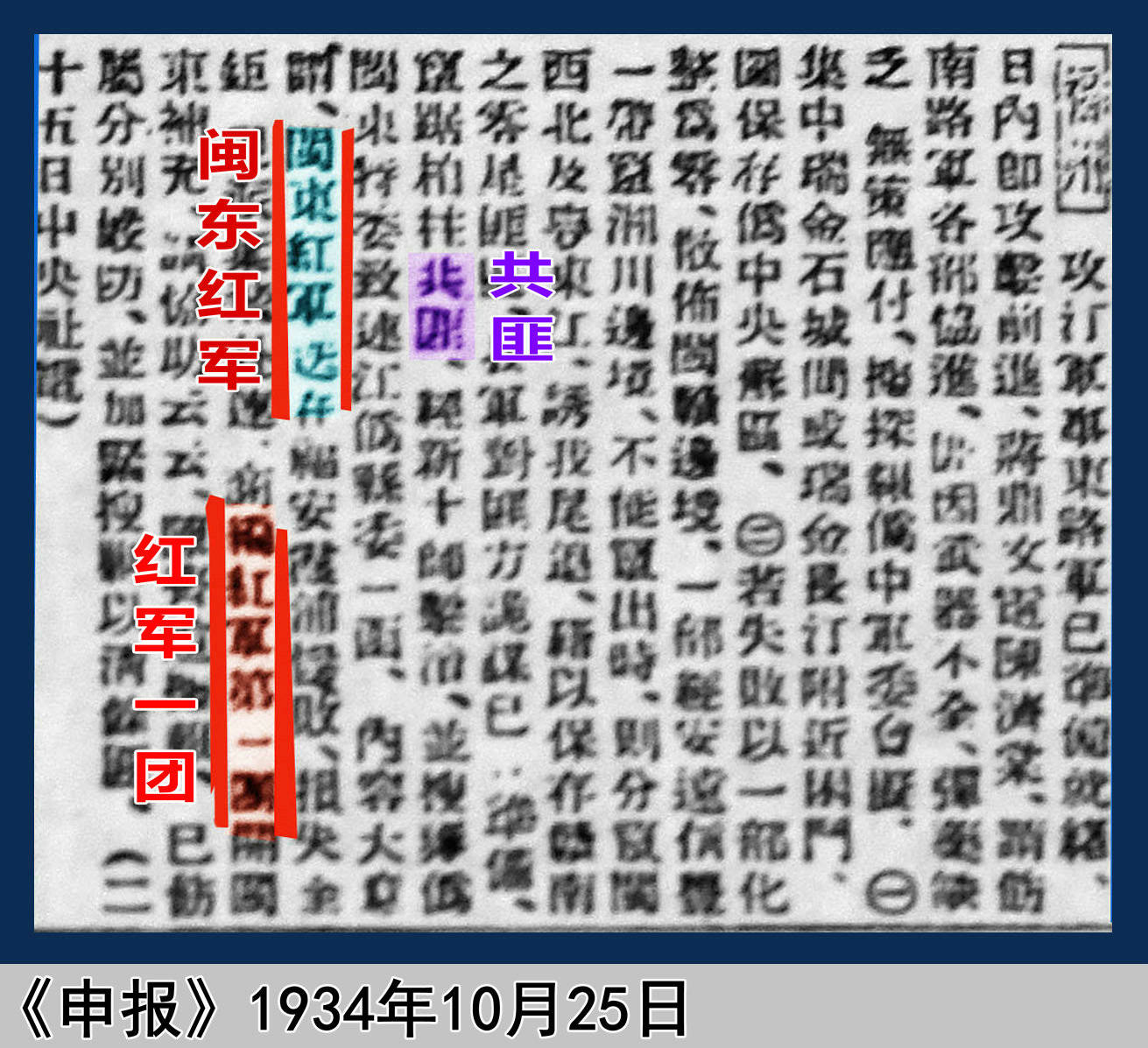 我查閲《申報》報道紅軍長征的新聞,1934年10月25日《贛匪南犯 與南路軍激戰》,第二則發自【福州】的報道260多字,使用“共匪”一次,使用“紅軍”兩次。