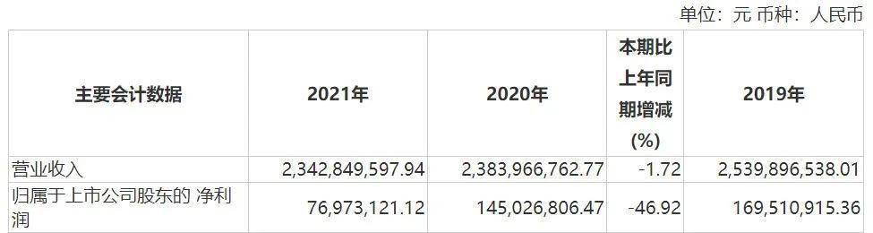 財報顯示,2021年,公司實現營收23.43億元,同比下滑1.72%;歸母淨利潤7697.31萬元,同比暴跌46.92%,幾近腰斬。