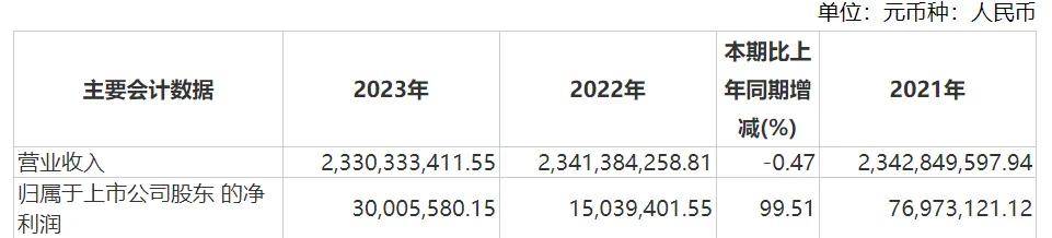 財報顯示,2022年,公司實現歸母淨利潤為1503.94萬元,同比大跌80.46%;2023年,歸母淨利潤終於同比上升99.51%至3000.56萬元,但和2021年相比,仍下滑了61%。