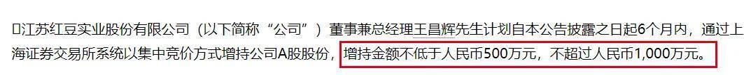 2024年2月,紅豆股份發佈公告稱,公司董事兼總經理王昌輝計劃自公告披露之日起6個月內,通過上交所以集中競價方式增持公司A股股份,增持金額不低於500萬元,不超過1000萬元。