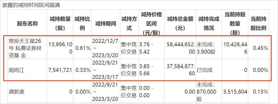 2022年9月至2023年3月,周鳴江將所持有的0.33%股份全部減持,套現3758.49萬元離場。