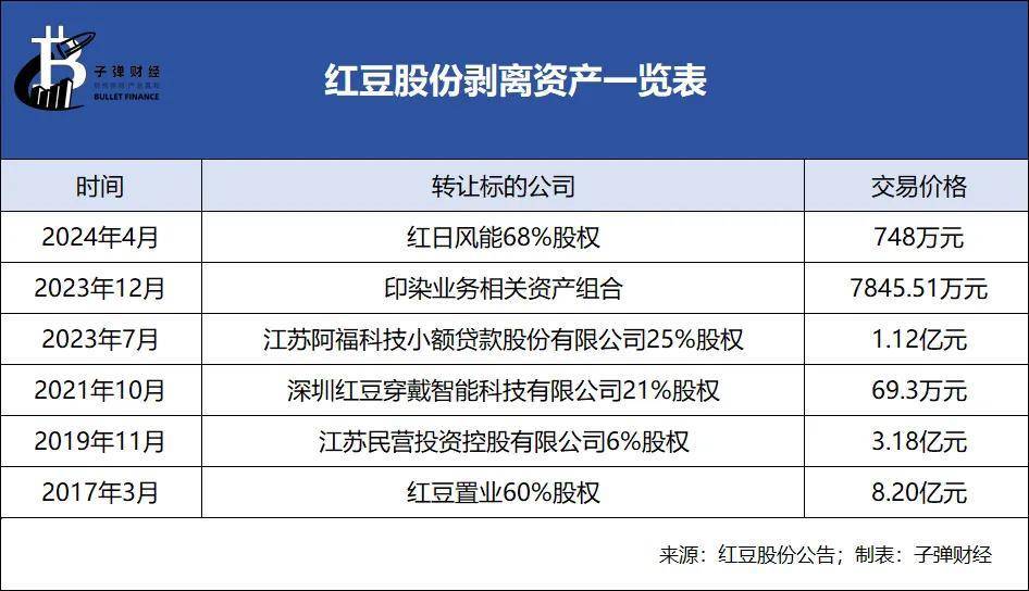 於是,紅豆股份又開始陸續“甩包袱”,重新聚焦男裝業務。據「界面新聞·子彈財經」不完全統計,2017年至2024年期間,公司先後剝離了房地產、印染、新能源、小額貸款等一眾業務。