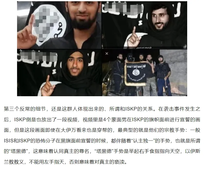 説二者的襲擊手法相似:此次襲擊似乎又是ISKP(伊斯蘭國呼羅珊行省)的“作品”。在襲擊發生後,ISKP控制下的傳媒渠道“Al-Azaim”立刻發聲,宣佈“向高加索的兄弟致敬”,等於是“認領”了自己實施的這次襲擊。