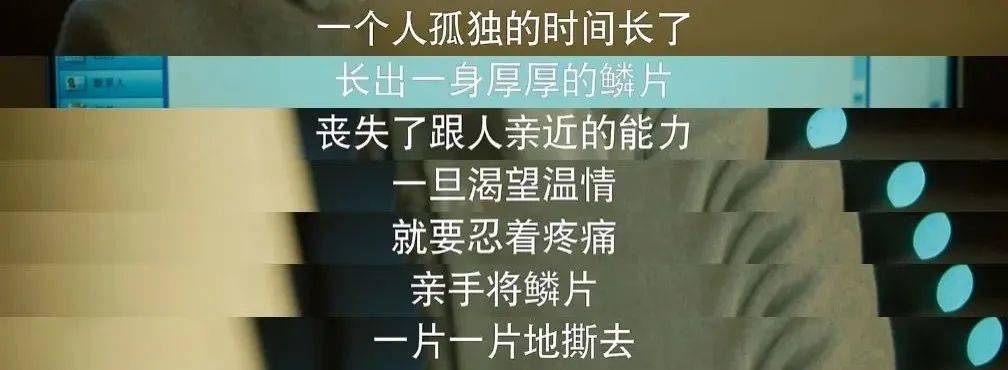 “一個人孤獨的時間長了,長出一身厚厚的鱗片,喪失了跟人親近的能力。一旦渴望温情,就要忍着疼痛,親手將鱗片一片一片地撕去。”