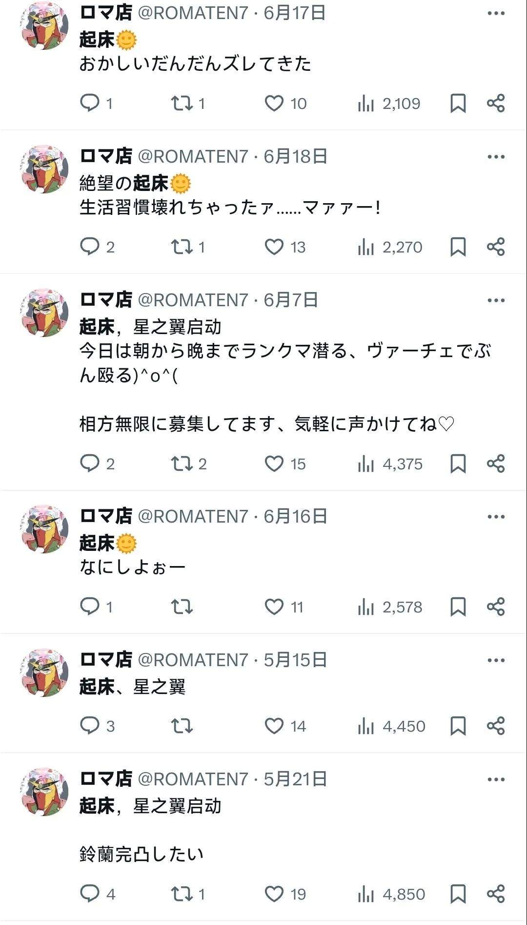 “羅馬店”的推特上,“起牀,星之翼啓動”成為了他新的口頭禪