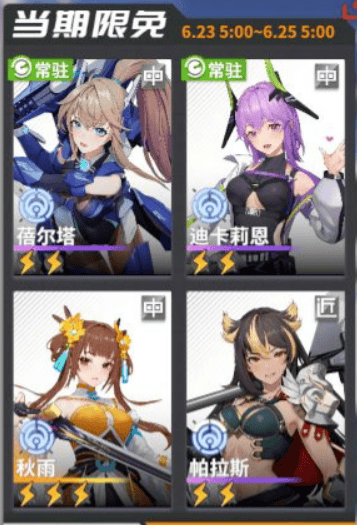 遊戲中的“當期限免”,指的是每2天會抽取4名角色作為免費試用開放給全部玩家,因為遊戲中並沒有“等級”、“戰力”這樣的長線養成要素,試用角色本身就是完全體。如果每個月支付30元人民幣購入“支援月卡”,則可以自選3名角色作為試用。