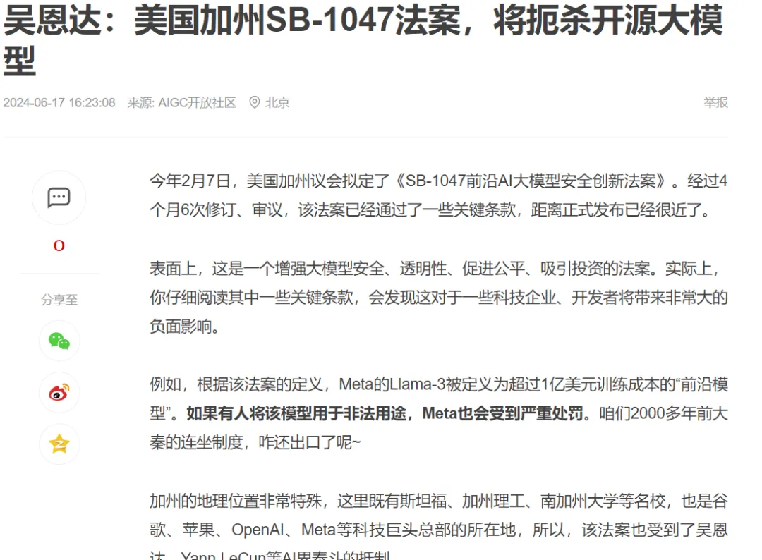 美國相關法律設立的過程中,輿論的爭論也是很激烈的,像AI領軍人物吳恩達最近就在批評加州的新法案將扼殺開源大模型。即使是山姆奧特曼這樣的熱點人物,美國的輿論場也有一些合理的質疑聲音。畢竟再好的新技術,也是會帶來全新的問題,不能全部肯定。