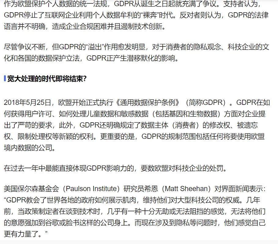 以互聯網領域為例,歐洲和美國關於數字安全都有十分詳細的法案,比如説歐盟的GDPR,對數字安全進行了嚴格而細緻的規定,國內的相關法律就在學習這些條例;即使是面對最新的AI技術,歐美也正在籌劃相關的法律,並沒有向某些人説的那樣不會管這方面的問題。